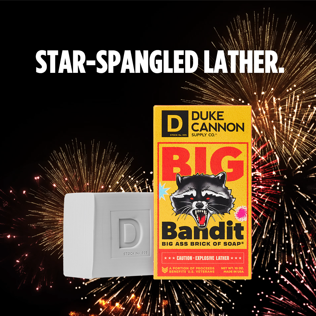 Every 4th of July, baseball takes a backseat as firing pyrotechnics into the air becomes our national pastime. But don't limit the fun to your backyard. Big Bandit Big Ass Bricks of Soap deliver explosive lather and a rich, smoky scent into the home of the brave—or more specifically, your shower. And right now, you can buy three (3) of these smoky bricks and SAVE 10%. Or, for those who like beer with their fireworks (observe all safety protocols, please), we have The Boom & Beer Box—4 bricks of soap (2 Big Bandits, 2 Beer soaps) for just $29.50.